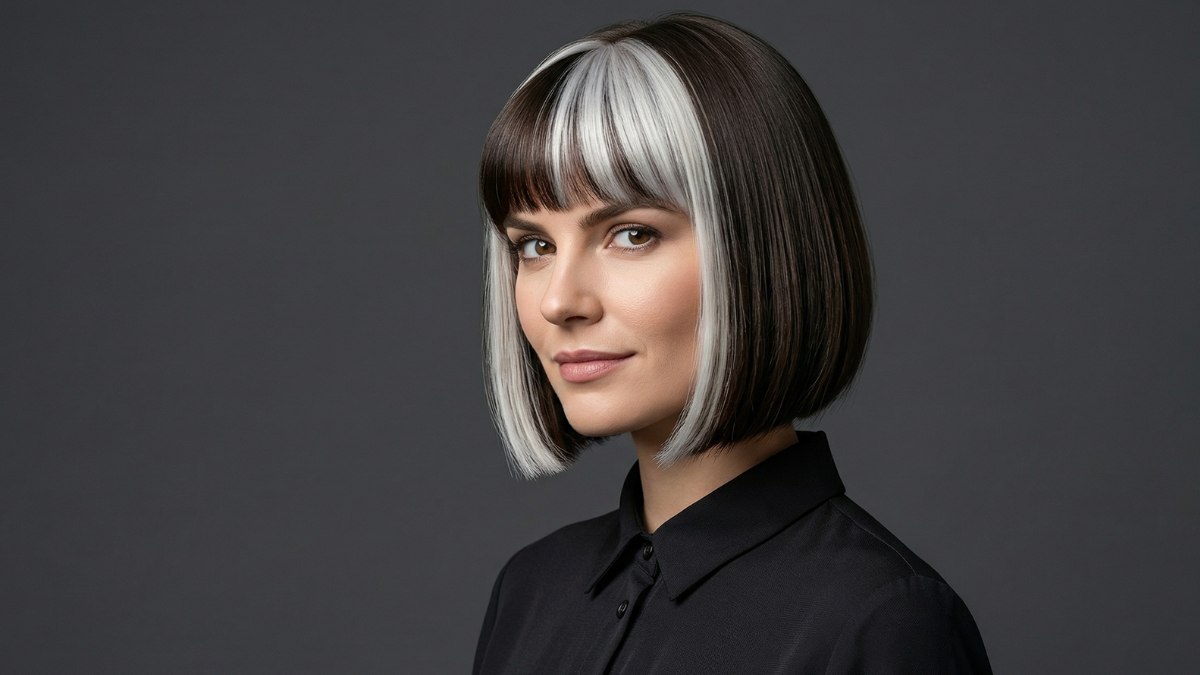 Ce look, destiné aux femmes audacieuses, métamorphose un carré classique et lisse en quelque chose d'exceptionnel en jouant avec le contraste le plus saisissant qui soit : un brun profond, presque noir, face à un blanc argenté éclatant.