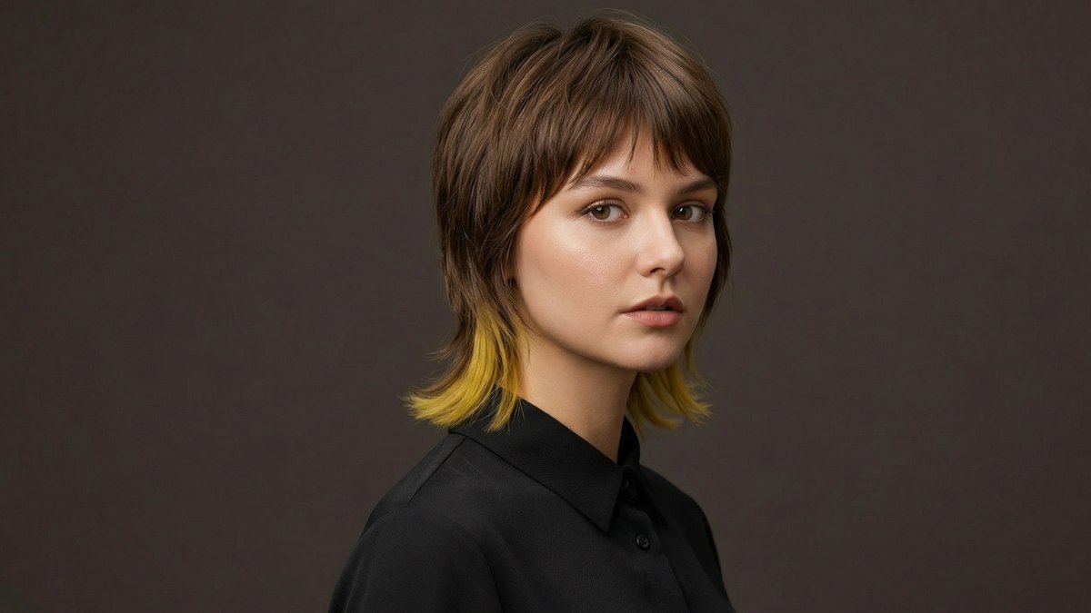 Puis viennent les pointes : une explosion de jaune vif, presque néon, sur les extrémités des cheveux. Une touche de couleur qui surgit là où on ne l'attendait pas. La base brun foncé ancre l'ensemble, de sorte que le jaune ne paraît pas chaotique ; il est simplement amusant.