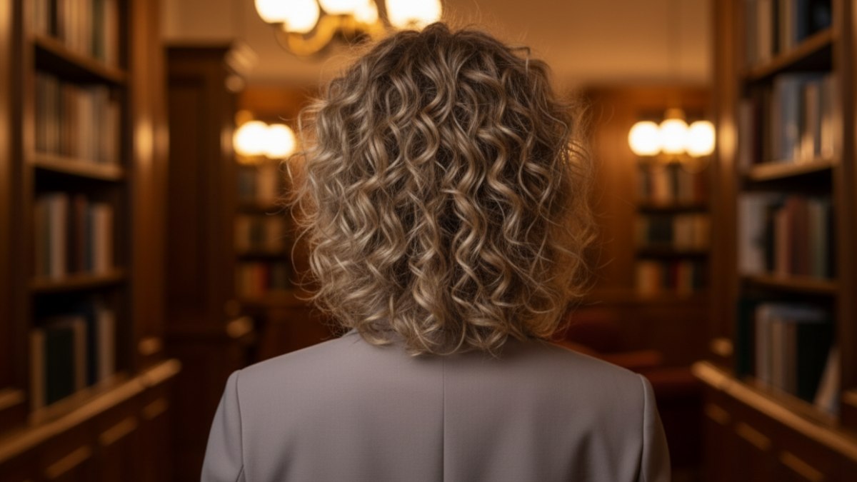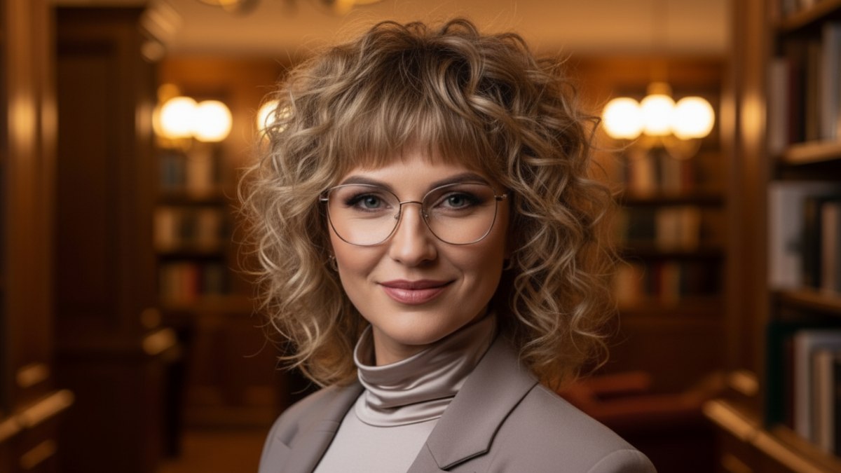 Associer cette chevelure texturée à un col roulé taupe brillant et à un blazer structuré est une excellente idée. L’habillement simple offre un cadre apaisé, laissant les cheveux occuper toute la scène. Les tons chauds des vêtements s’accordent parfaitement au blond miel, et le contraste entre le blazer structuré et les boucles libres crée une harmonie très séduisante.