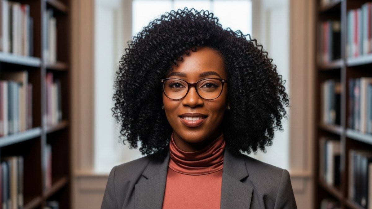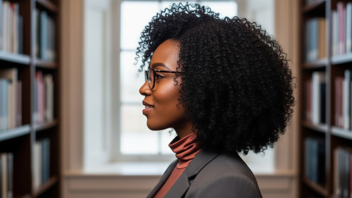 La tenue complète admirablement la coiffure. Le blazer structuré équilibre le volume des cheveux, tandis que le col roulé soyeux couleur terre cuite reflète la richesse de la teinte capillaire. Les lunettes aux lignes épurées ajoutent une touche raffinée et intellectuelle, prouvant que les coiffures audacieuses et naturelles ont parfaitement leur place dans un environnement professionnel.