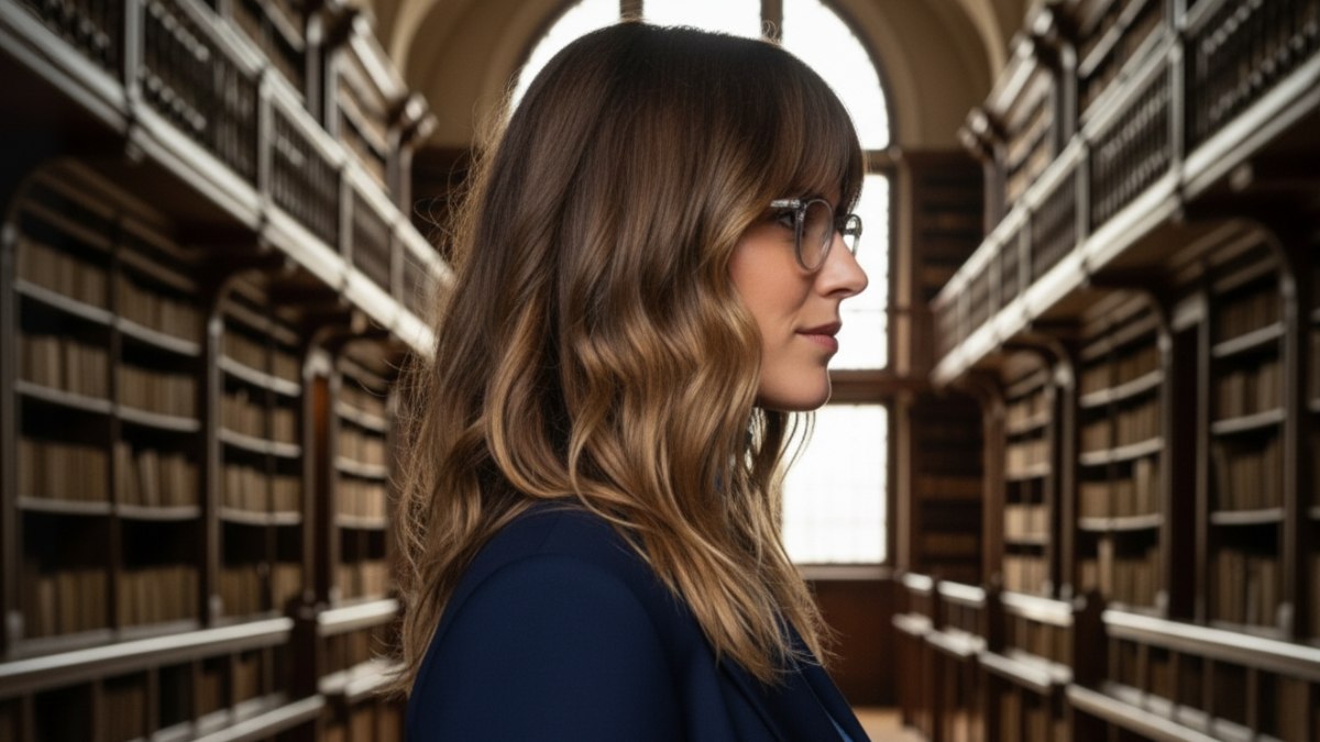 Les cheveux s’harmonisent parfaitement avec le blazer et le col roulé soyeux, et les vêtements aux tons froids créent un beau contraste avec la couleur chaude de la chevelure, faisant ressortir les deux. Les lunettes à monture transparente complètent l’allure contemporaine et intellectuelle.