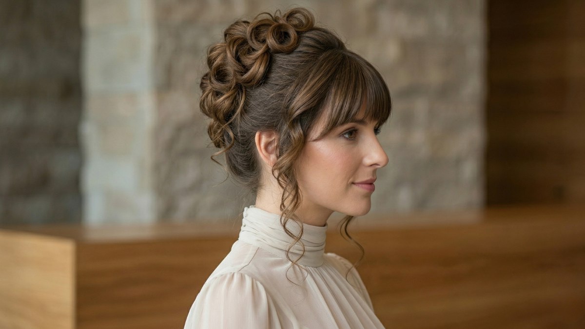 Cette coiffure semble tout droit sortie d'un livre de contes. Les cheveux sont relevés en un chignon constitué de boucles agencées presque comme une sculpture. Quelques petites mèches sont laissées libres pour encadrer le visage, ce qui donne un aspect aérien et poétique plutôt que strict. La frange, quant à elle, apporte une touche de modernité à ce grand classique.