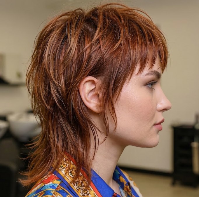 Il y a quelque chose d’indéniablement cool dans un shag bien réalisé, et cette version moderne de la coupe classique en est la parfaite illustration. La couleur des cheveux est un auburn superbe, réchauffé par des reflets cuivrés qui donnent à l’ensemble une luminosité presque intérieure.