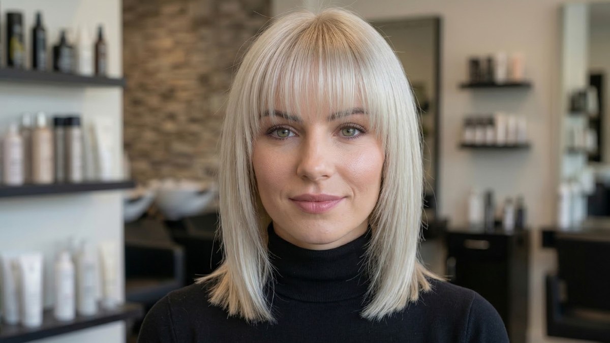 Lisse et structuré, ce carré long blond platine mise sur des lignes franches et des tons froids. Coupée juste au niveau des épaules, cette coiffure droite maximise la brillance et le mouvement. Une frange douce encadrant le visage ajoute une touche délicate à cette silhouette nette.