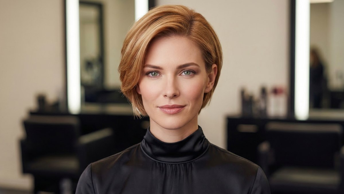 Portée de manière décontractée, avec une mèche glissée derrière l’oreille, cette coiffure dégage une fraîcheur spontanée. Les nuances chaleureuses flattent toutes les carnations et s’harmonisent parfaitement avec une blouse noire brillante pour un contraste raffiné.