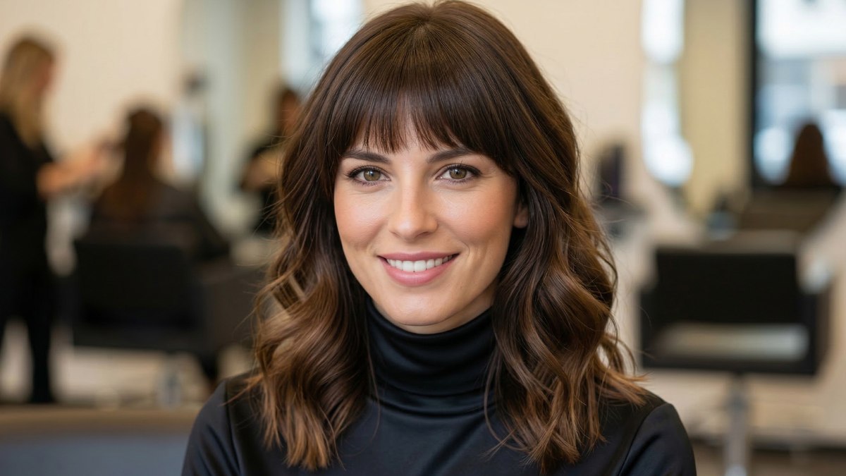 Des mèches encadrant le visage adoucissent la forme globale, tandis qu’une frange pleine ajoute une touche de jeunesse. Que ce soit pour la journée ou une soirée, cette coiffure reste toujours flatteuse et intemporelle. Son col roulé noir brillant constitue un écrin parfait pour sa chevelure somptueuse !