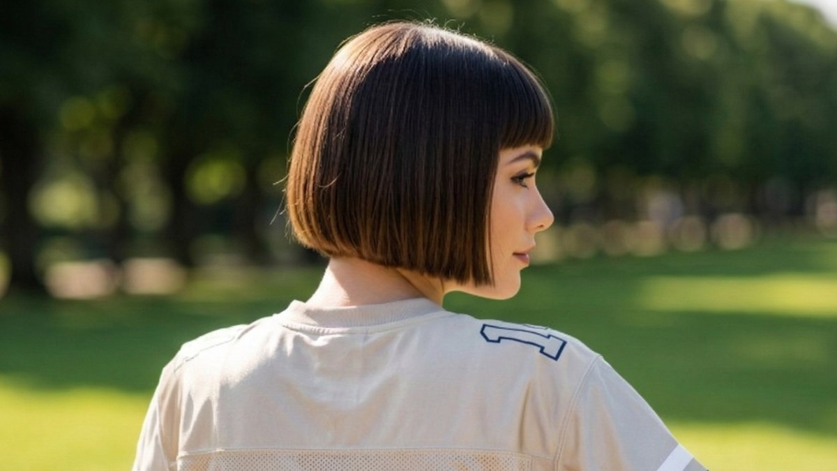 Les cheveux arrivent au niveau de la mâchoire en une seule ligne droite et franche, créant une silhouette si nette qu’elle semble avoir été tracée au rasoir et à la règle. Une frange épaisse et parfaitement droite repose sur le front, encadrant le visage comme un portrait et attirant immédiatement le regard vers les pommettes et les yeux.