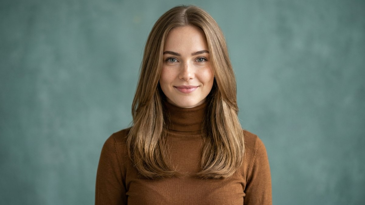Elle avait une coiffure longue, douce et gracieuse. Ses cheveux d'un brun chaud étaient légèrement dégradés pour rester très lisses. La couleur était un brun riche et naturel, et l’ensemble était très soigné.