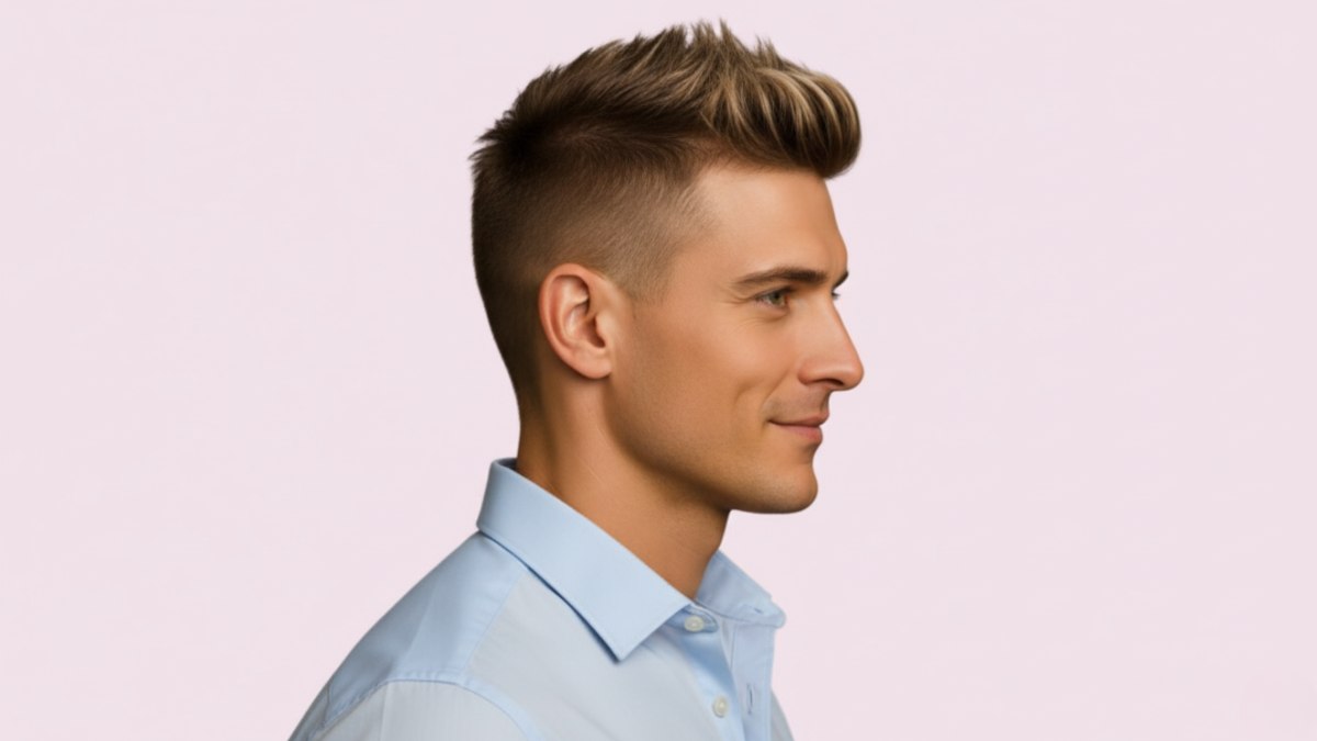 La beauté de ce style tient dans ses lignes nettes qui encadrent le visage. Le dessus balayé attire le regard vers le haut, tandis que les côtés courts gardent l’ensemble soigné. C’est masculin sans excès, élégant sans effort.