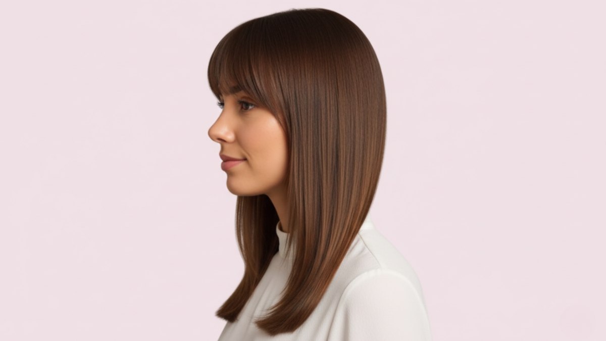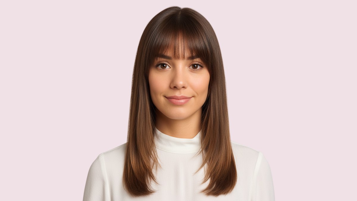 Ce style met en valeur vos traits sans les dominer. La frange attire l’attention sur les yeux et les pommettes, tandis que la longueur droite dessine une ligne élégante et flatteuse.
