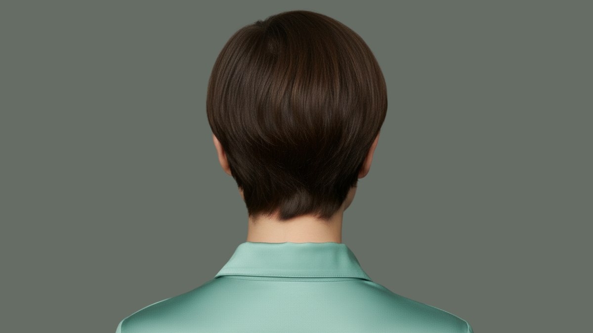 La couleur est brune, presque chocolat noir, avec de subtiles variations de profondeur. Cette approche monochrome fonctionne parfaitement avec les lignes nettes de la coupe, mettant en valeur la forme et la structure sans distraction. La finition lisse et brillante suggère des cheveux en excellente santé, bien soignés, qui réfléchissent la lumière et offrent une apparence luxueuse.