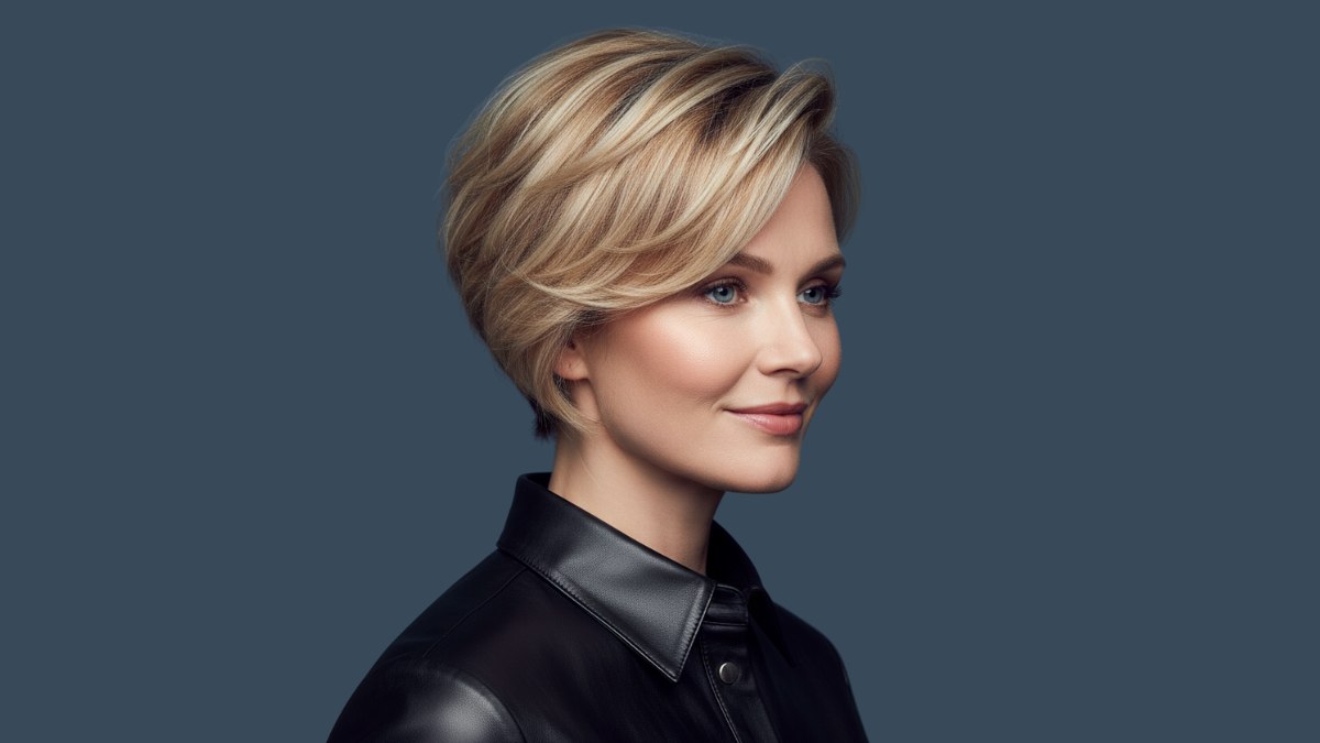 La chemise en cuir noir crée un contraste saisissant avec la couleur blonde des cheveux, faisant ressortir toute leur luminosité. La teinte sombre et sophistiquée du vêtement constitue un arrière-plan idéal pour mettre en valeur les nuances du blond, tandis que la structure du cuir fait écho à la précision de la coupe.