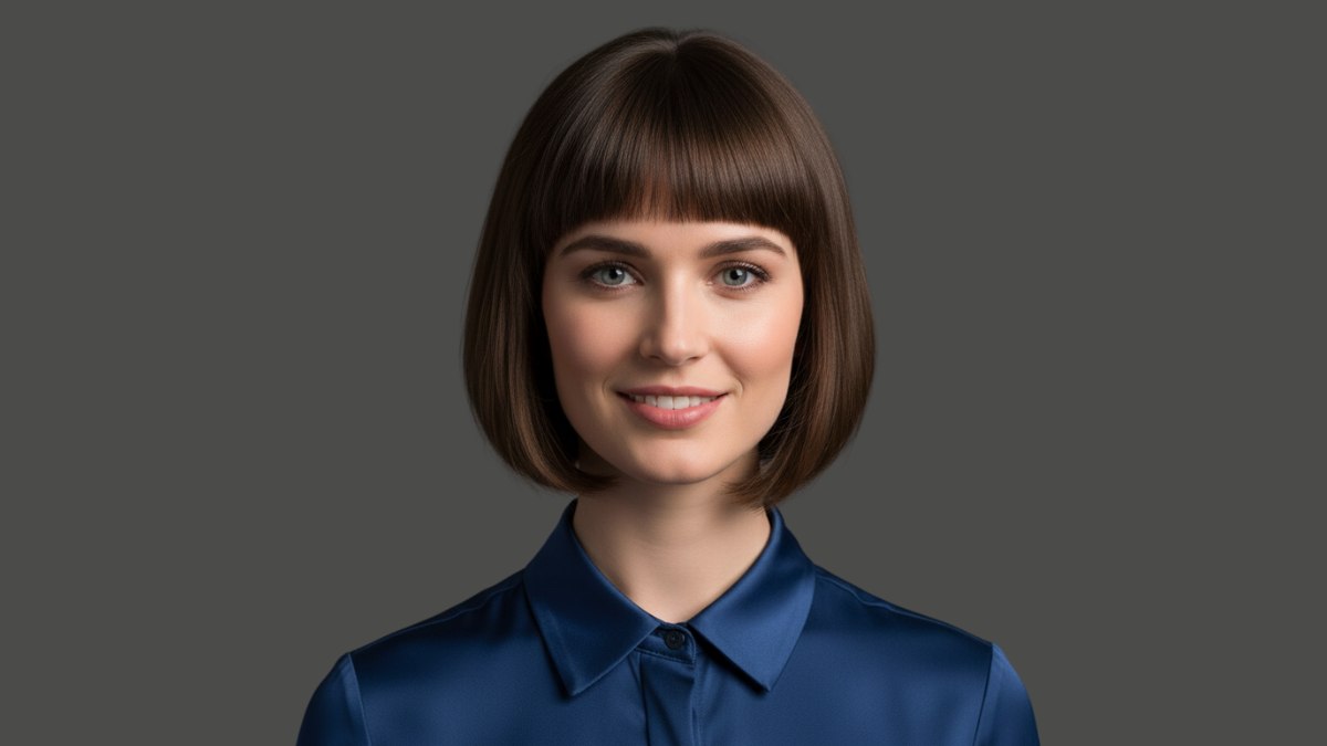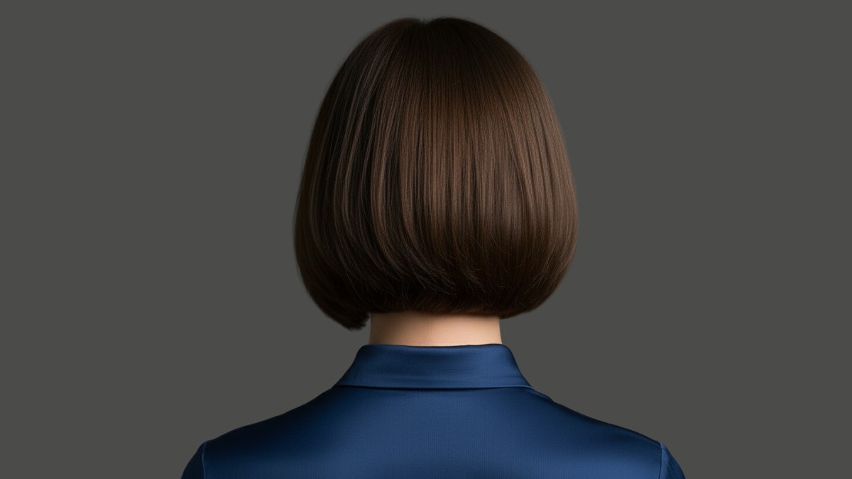La couleur des cheveux est un brun chocolat avec de subtiles variations de profondeur qui accrochent la lumière. La chevelure présente une brillance naturelle qui témoigne d’une excellente santé et de soins adaptés. Les cheveux semblent épais, donnant du corps et du mouvement au carré, sans frisottis ni mèches rebelles venant perturber la ligne nette.