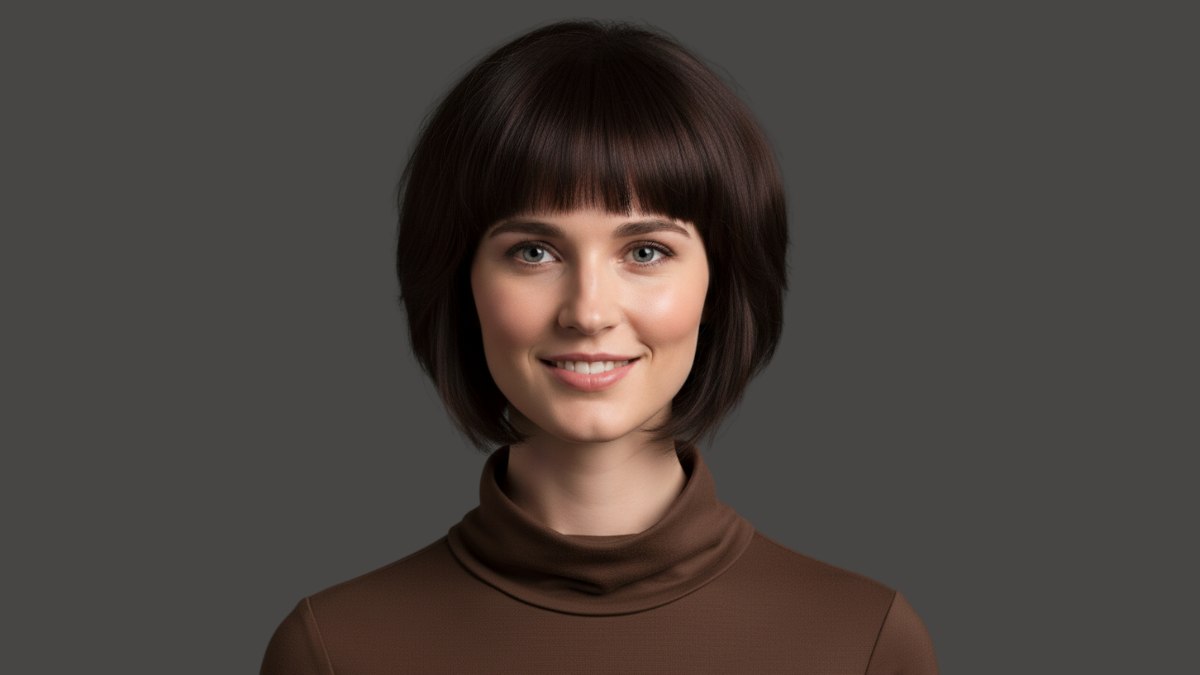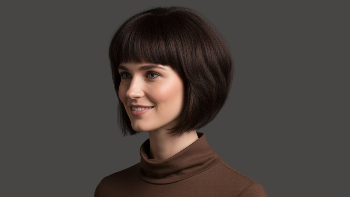 Le col roulé brun s’accorde très bien avec cette coiffure. L’approche monochrome permet aux belles nuances de la couleur des cheveux de s’exprimer pleinement, sans concurrence visuelle. Le col haut crée une ligne nette et élégante qui met parfaitement en valeur la forme du carré, tandis que la teinte brun chaud s’harmonise avec la richesse de la palette capillaire.