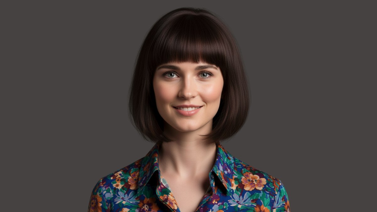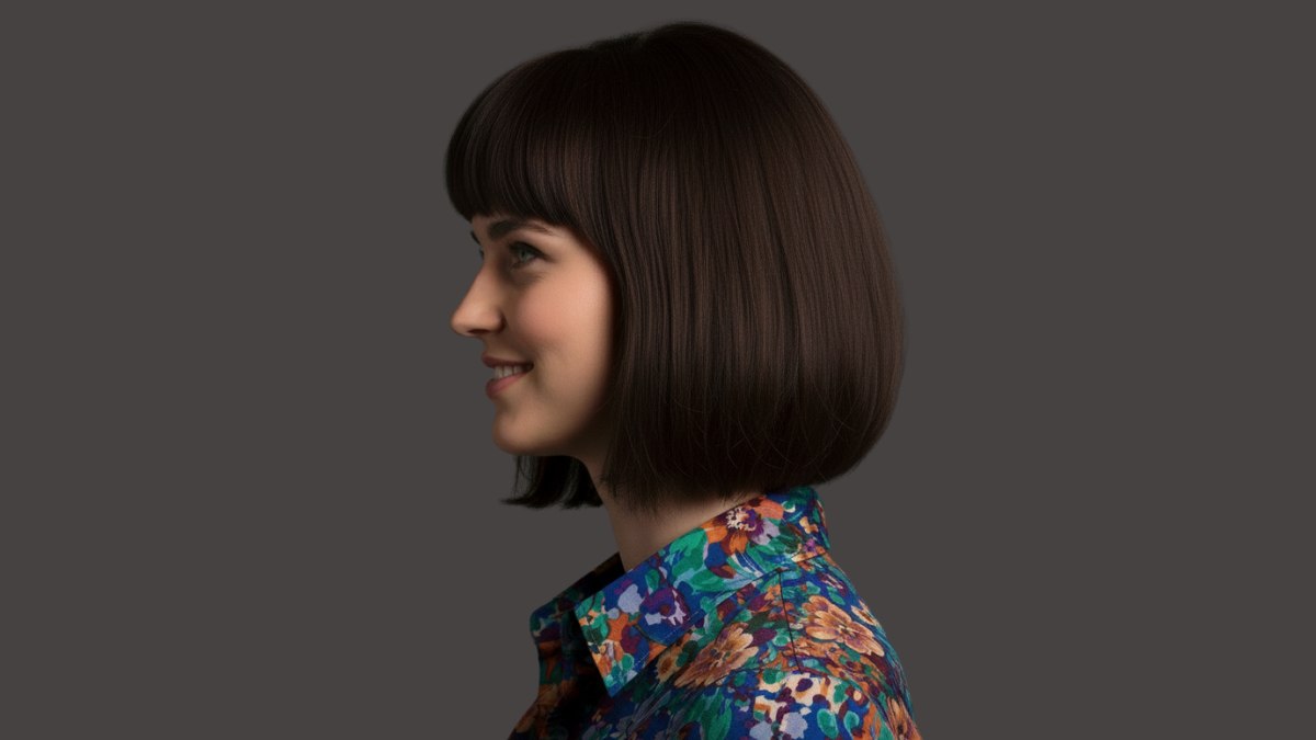 La couleur est un brun très foncé, presque noir, riche et intense. Cette teinte profonde crée un contraste avec les peaux claires et donne aux cheveux une apparence brillante et saine. L’uniformité de la couleur met l’accent sur les lignes nettes de la coupe et sur la brillance naturelle de la chevelure.