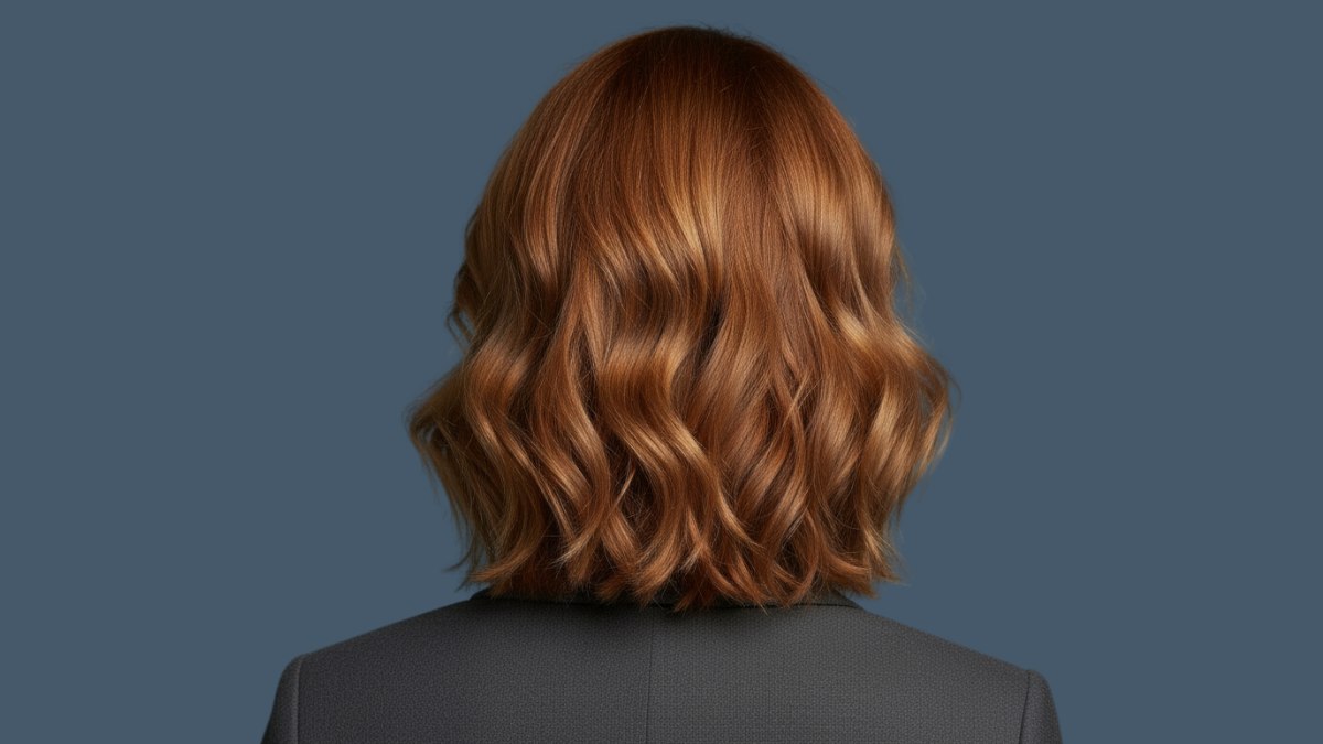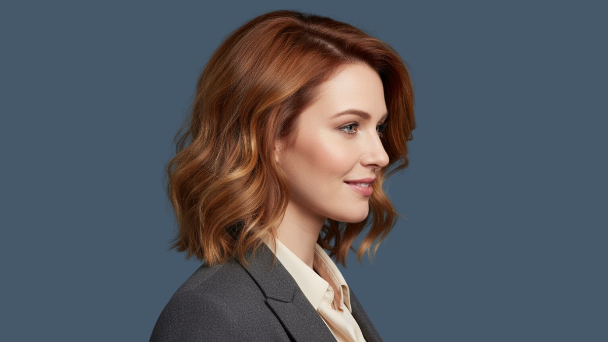 Ce carré mi-long révèle l’élégance de belles ondulations associées à une palette de couleurs auburn riches et multidimensionnelles. La coupe arrive juste au-dessus des épaules, créant un encadrement flatteur pour le visage et le cou.