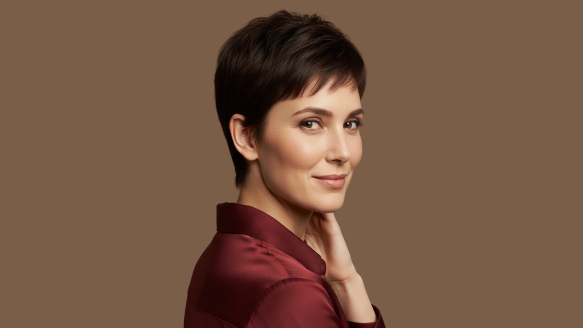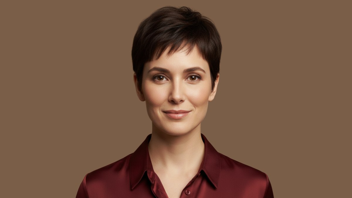 Ce qui rend cette coupe pixie particulièrement spéciale, c’est l’attention portée aux détails du coiffage. Les cheveux sont lissés avec soin, tandis que les mèches frontales sont légèrement texturisées pour créer un mouvement doux autour du visage. Cette coiffure met merveilleusement en valeur les traits, notamment les yeux et la structure osseuse, créant une allure ouverte et fraîche.