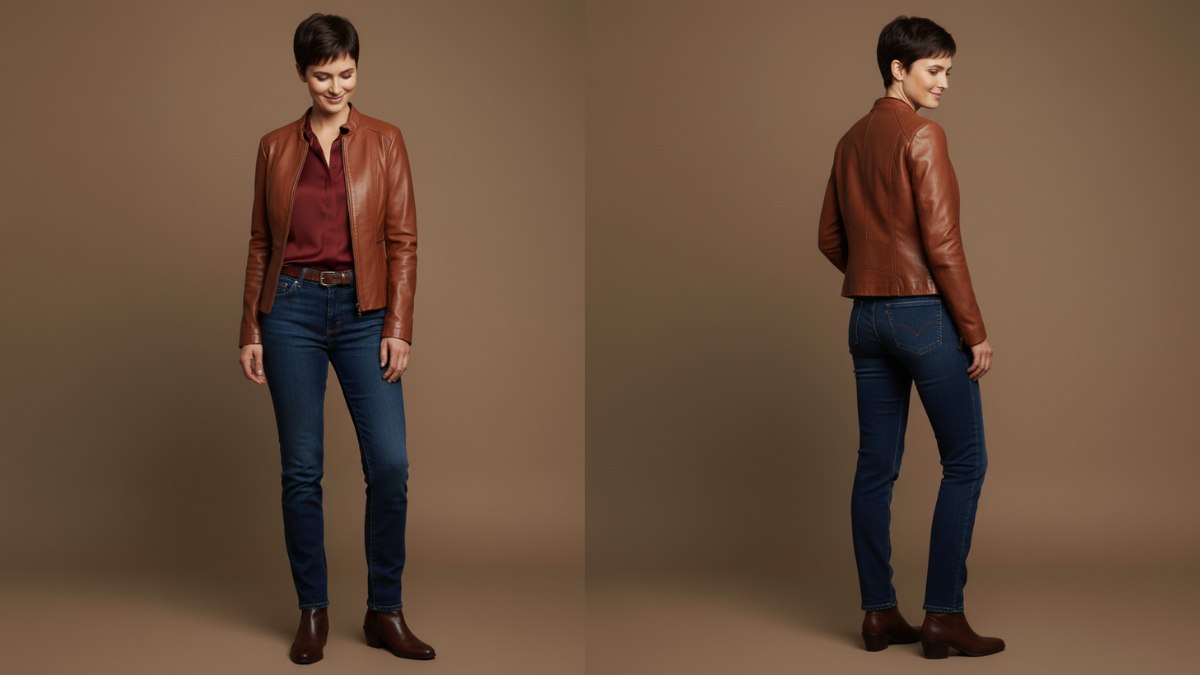 Le chemisier en soie bordeaux choisi pour ce look est idéal. Sa couleur riche crée un contraste luxueux avec les cheveux foncés tout en restant dans une même famille de tons froids, pour une harmonie visuelle. Le tissu soyeux fait écho au fini brillant des cheveux, et le col classique complète parfaitement les lignes nettes de la coupe pixie.