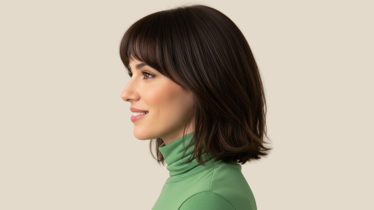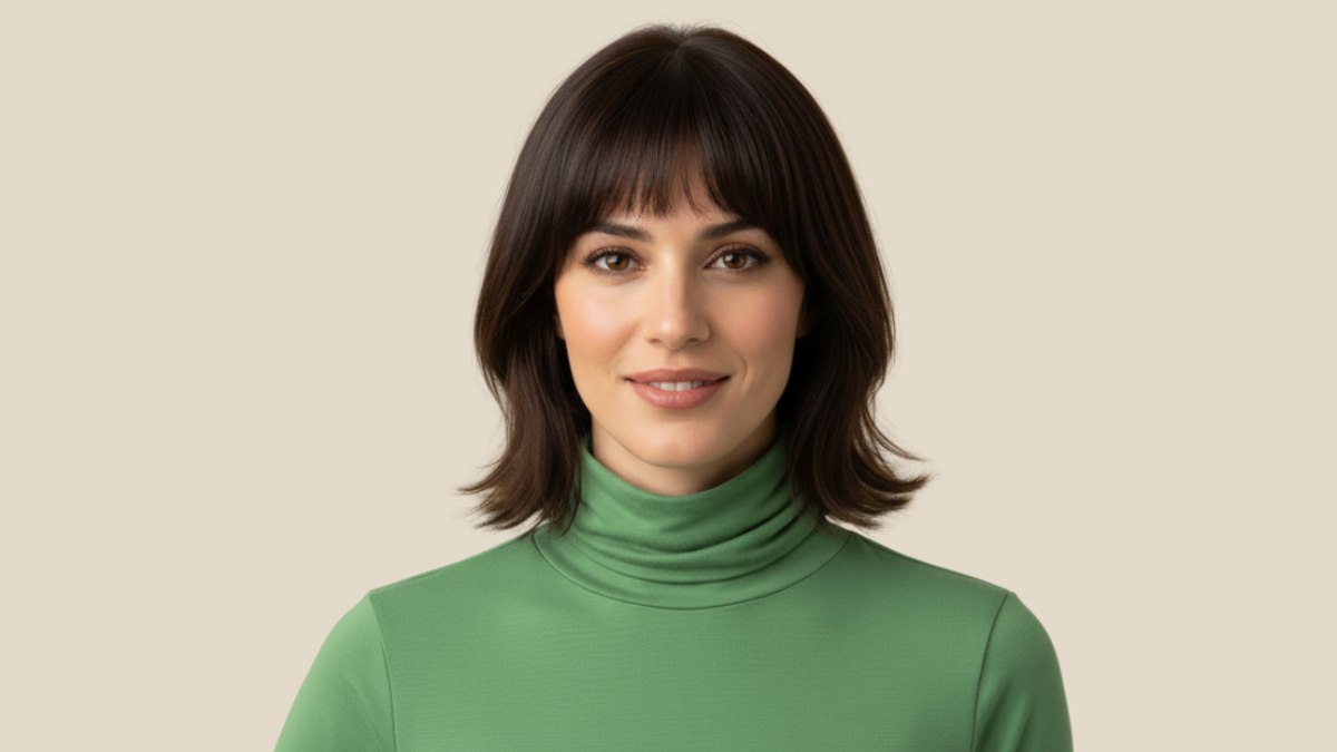 Le col roulé vert s’accorde parfaitement avec cette coiffure. Sa teinte organique et naturelle reflète l’esprit détendu de la coupe, tandis que sa structure maintient une allure sophistiquée. La couleur met aussi en valeur les reflets chauds des cheveux, créant une harmonie globale moderne et fraîche.