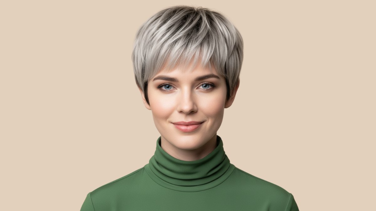 Cette coiffure courte surprend par sa couleur froide et sa très belle forme. La coupe est une coupe à la garçonne, avec une longueur marquée sur le dessus et le sommet de la tête, qui s’affine progressivement vers des côtés et un arrière plus courts.