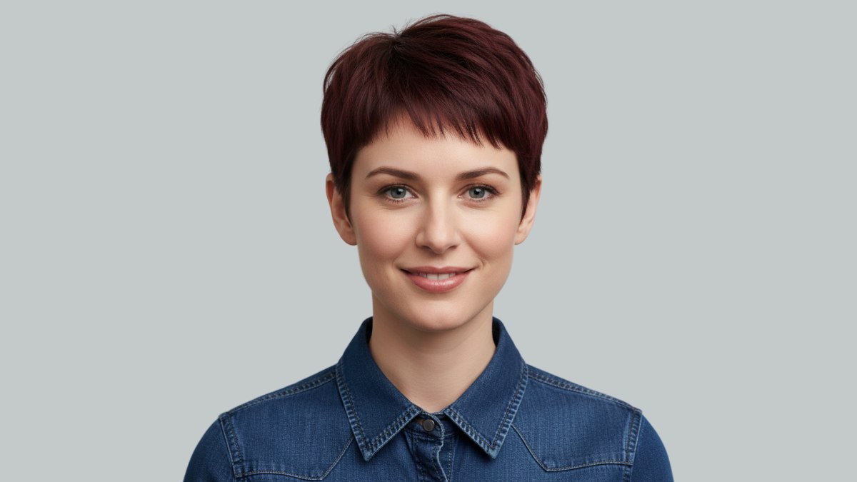 Le choix d’une chemise en denim classique s’accorde parfaitement avec cette coiffure. Le caractère décontracté mais intemporel du denim complète les lignes modernes et épurées de la coupe à la garçonne sans entrer en concurrence visuelle. Le col de la chemise fait écho à la précision de la coupe, tandis que le denim rend l’ensemble facile à porter au quotidien.
