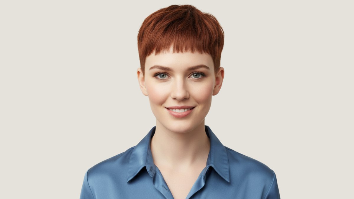 La chemise en soie bleue est un excellent choix avec cette coiffure courte. La tonalité froide du tissu crée un contraste complémentaire très élégant avec l’auburn chaud des cheveux, mettant en valeur les deux éléments.