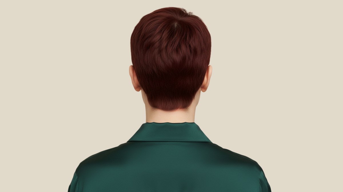 La couleur des cheveux est un brun acajou profond aux tons froids, proche du brun chocolat, avec de légers reflets rouges qui se révèlent selon l’éclairage. Cette nuance sophistiquée apporte de la profondeur à la coupe et rend la précision des lignes encore plus évidente. Cette teinte foncée est particulièrement efficace pour créer un look affirmé.