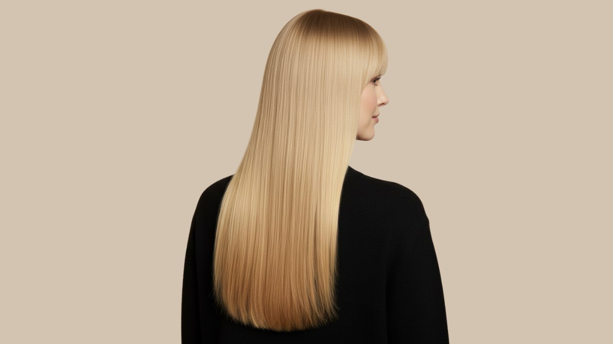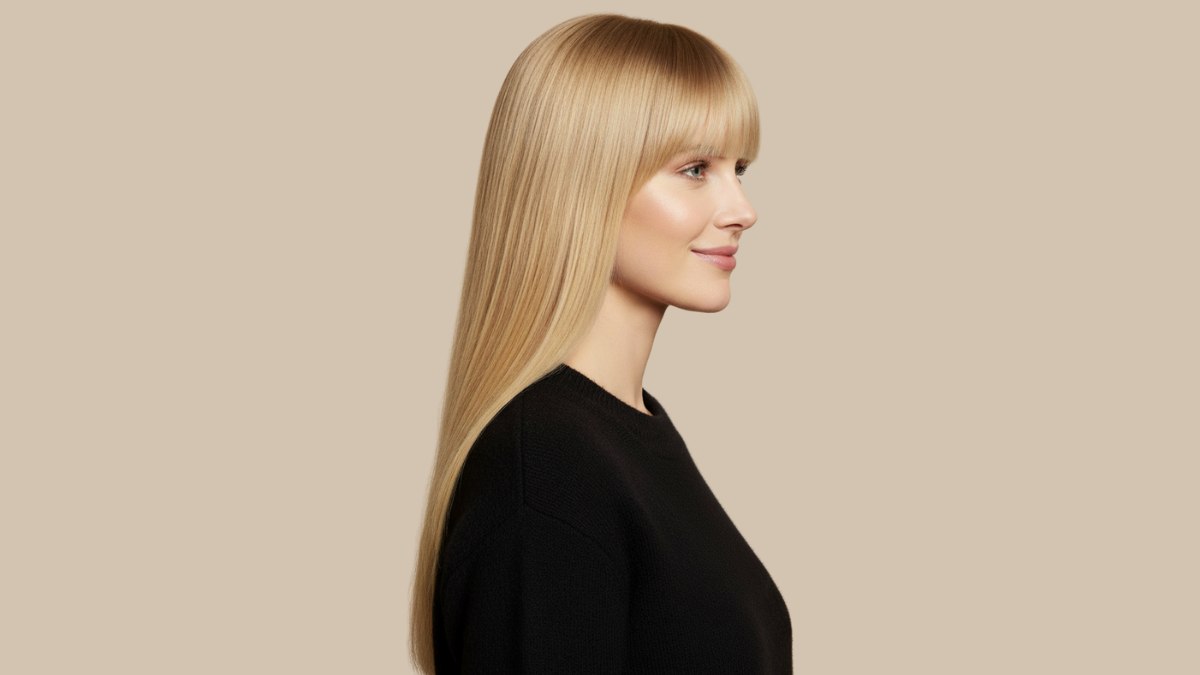 Le coiffage est lisse et soyeux, avec un brushing bien droit qui souligne la précision de la coupe et l’homogénéité de la couleur. La frange est travaillée avec une légère courbure vers l’intérieur, ce qui adoucit subtilement l’ensemble tout en conservant sa force visuelle.