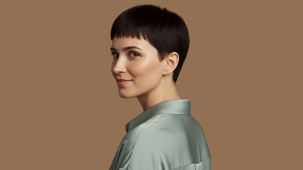 Cette coupe à la garçonne ultra-courte dégage une grande assurance et une modernité affirmée. Les côtés et l’arrière sont coupés très courts, créant une forme nette qui met en valeur la structure osseuse du visage et la ligne du cou.