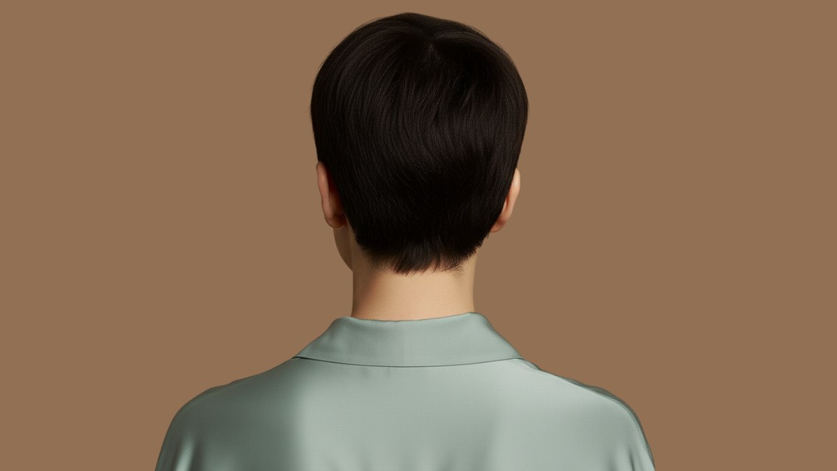 La couleur des cheveux est un brun espresso profond - presque noir selon la lumière - avec un fini brillant qui reflète la lumière. Cette teinte sombre et saturée renforce l’intensité de la coupe déjà très marquée, donnant un résultat résolument chic. L’uniformité de la couleur souligne les lignes nettes de la coupe et rend chaque angle particulièrement précis.
