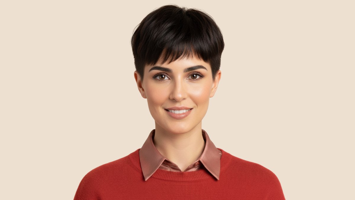 Le pull orange-rouge et le col de chemise mauve composent une harmonieuse palette de couleurs qui accompagne parfaitement l’audace de cette coupe courte. Les tons chauds de la tenue adoucissent l’intensité du noir profond, pour un look à la fois affirmé et équilibré.