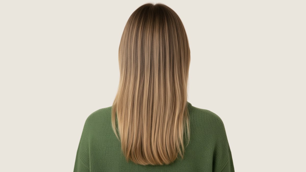 Cette coiffure présente de longs cheveux qui tombent au-delà des épaules, créant un beau mouvement et une dimension harmonieuse. La précision des légères dégradés est particulièrement visible de dos, où chaque mèche se fond parfaitement dans la suivante, formant une silhouette lisse, ni trop lourde ni trop aérienne.