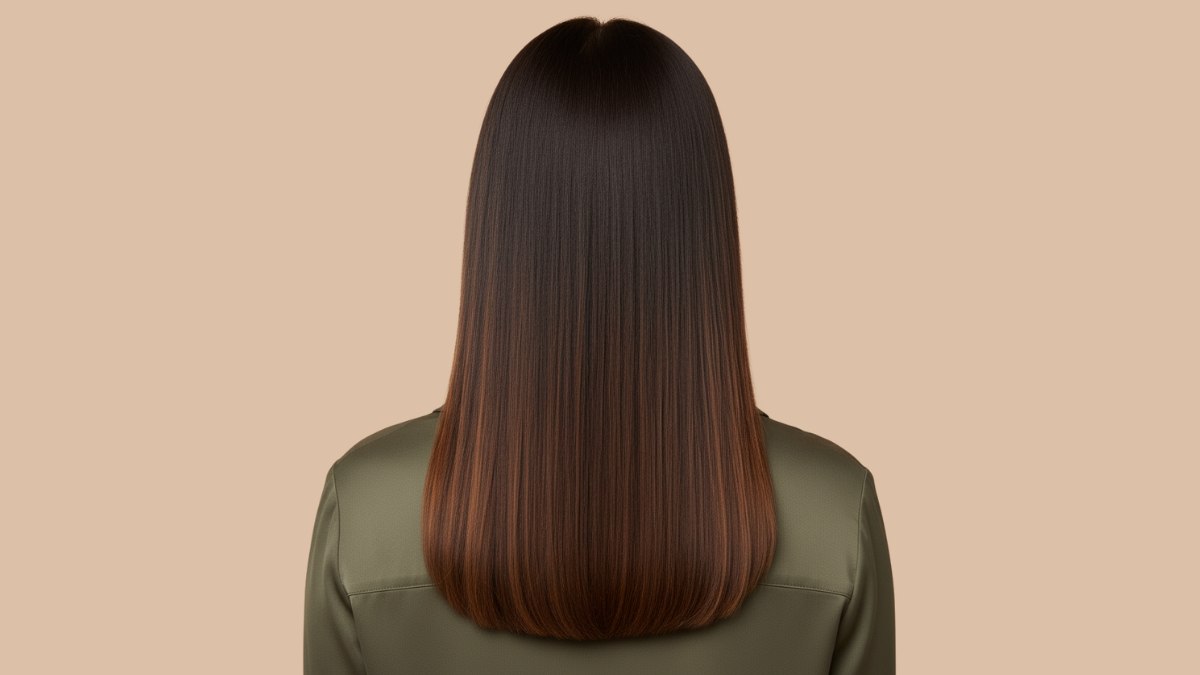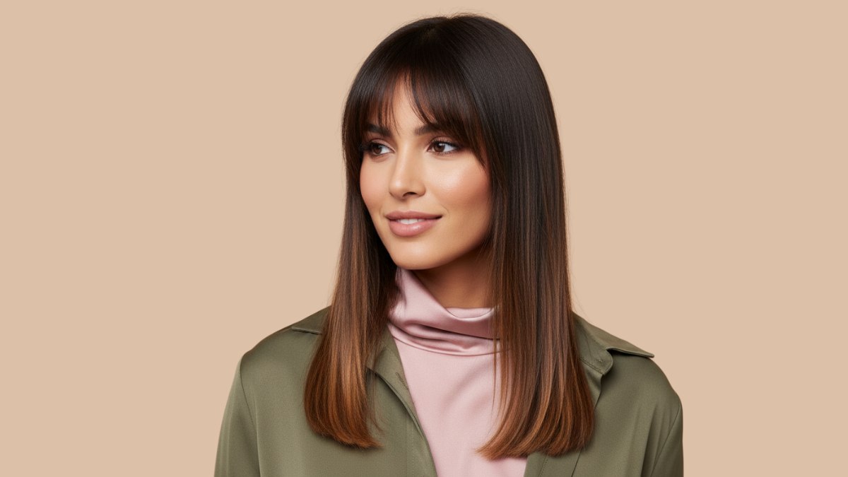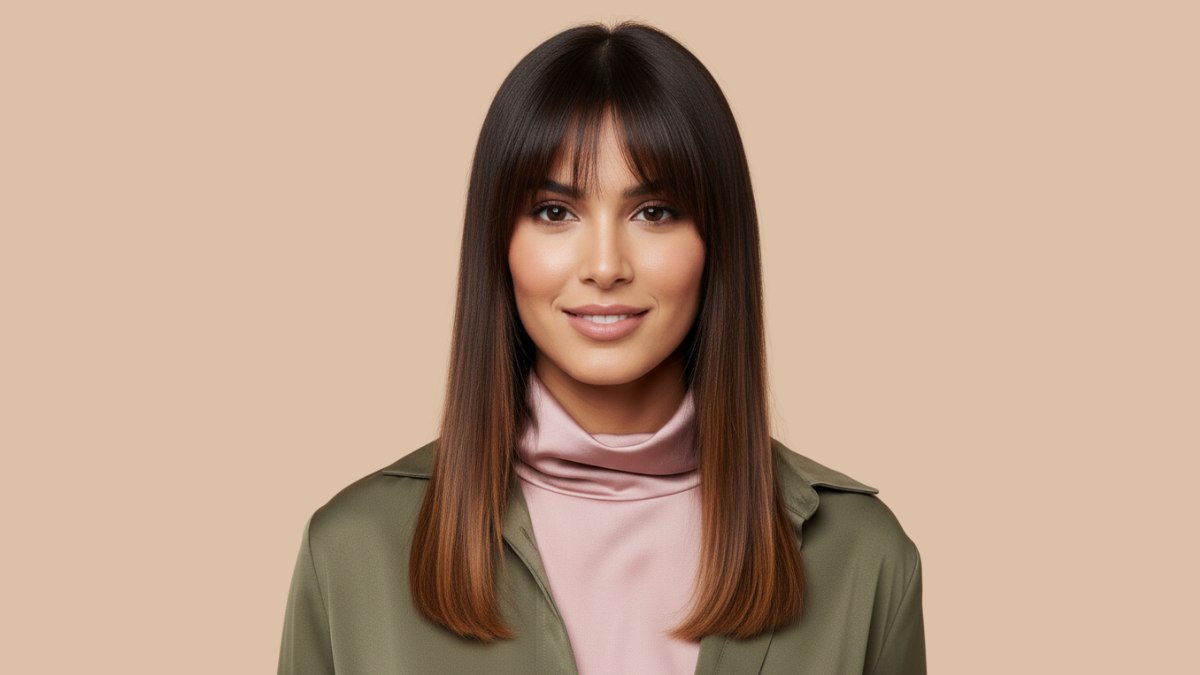 Le coiffage est lisse, travaillé au fer pour un fini brillant. Les cheveux restent souples, sans paraître rigides ou trop transformés, et les pointes ont un léger mouvement qui donne de la vie à la coupe. La frange rideau est coiffée avec une douce courbe qui se fond harmonieusement dans le reste de la chevelure.