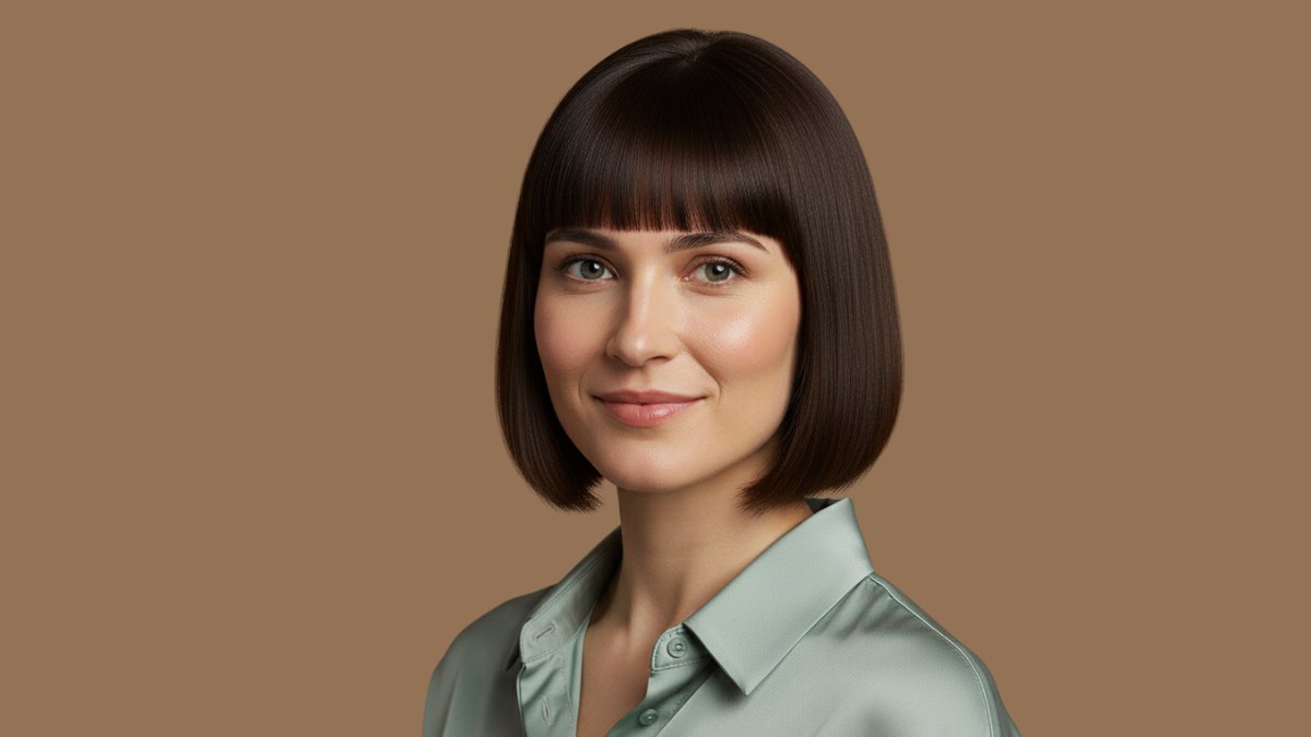 La couleur est un brun riche et brillant qui capte la lumière, créant de la dimension grâce à sa profondeur naturelle plutôt qu’à des contrastes marqués. Cette couleur en procédé unique possède un éclat presque miroir qui témoigne d’un coiffage expert. Une frange droite, coupée juste au-dessus des sourcils, ajoute une touche chic à l’ensemble.