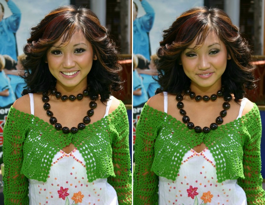 Brenda Song sports the Farrah Fawcett look with her hair curled to feather back into smooth swoops and rolls away from her face. The red and reddish-orange stripes easily display the direction of her hairstyle.