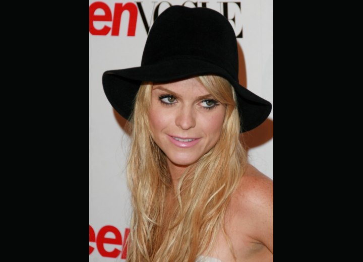 Let your hair fall naturally over your shoulders and top off your look with your favorite hat. With expressive, long-lashed eyes like Taryn's, opt for a subdued, light-colored lipstick to complement the overall look.