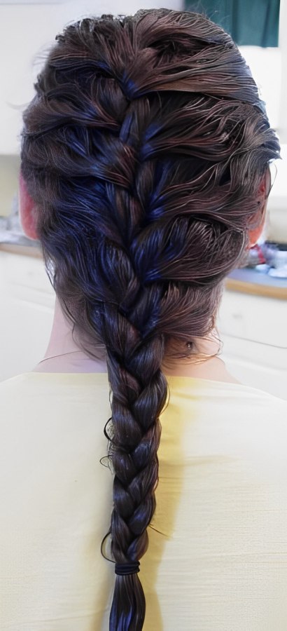 Paso cinco: Cuando hayas llegado a la nuca, puedes terminar la trenza como sea que quieras. Puedes juntar el pelo con una banda elástica a la altura del cuello y dejar el pelo restante libre o puedes continuar cruzando las corrientes derecha-sobre-medio e izquierda-sobre-medio hasta que llegues al final del cabello.
