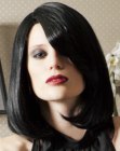 Cette coupe longue est réalisée au rasoir. Seuls les contours sont dégradés et les mouvements sont facilités par la technique du piquetage inversé. Le coiffage est réalisé à la grosse brosse ronde.