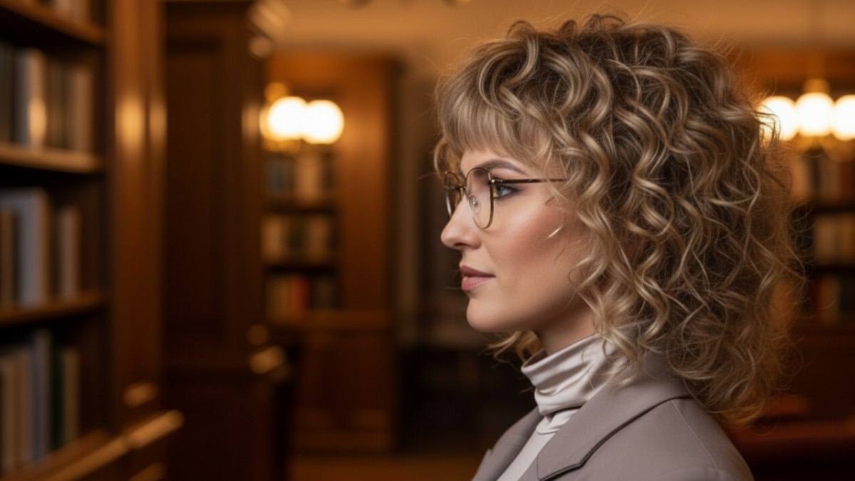 Associer cette chevelure texturée à un col roulé taupe brillant et à un blazer structuré est une excellente idée. L’habillement simple offre un cadre apaisé, laissant les cheveux occuper toute la scène. Les tons chauds des vêtements s’accordent parfaitement au blond miel, et le contraste entre le blazer structuré et les boucles libres crée une harmonie très séduisante.