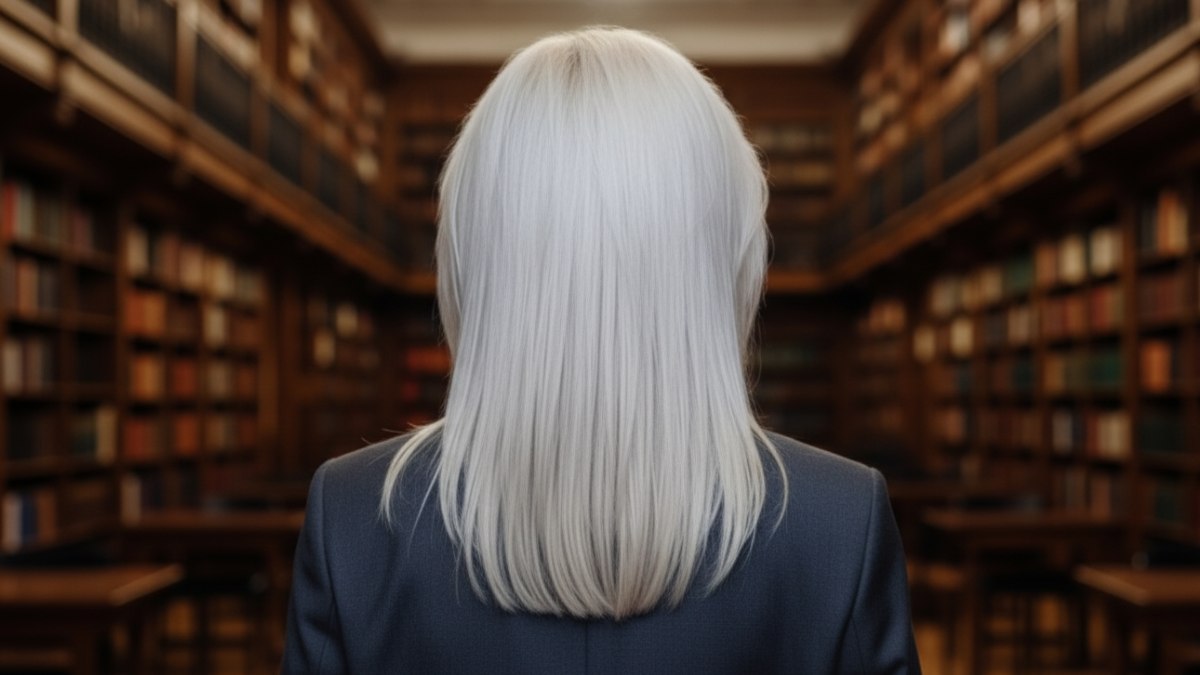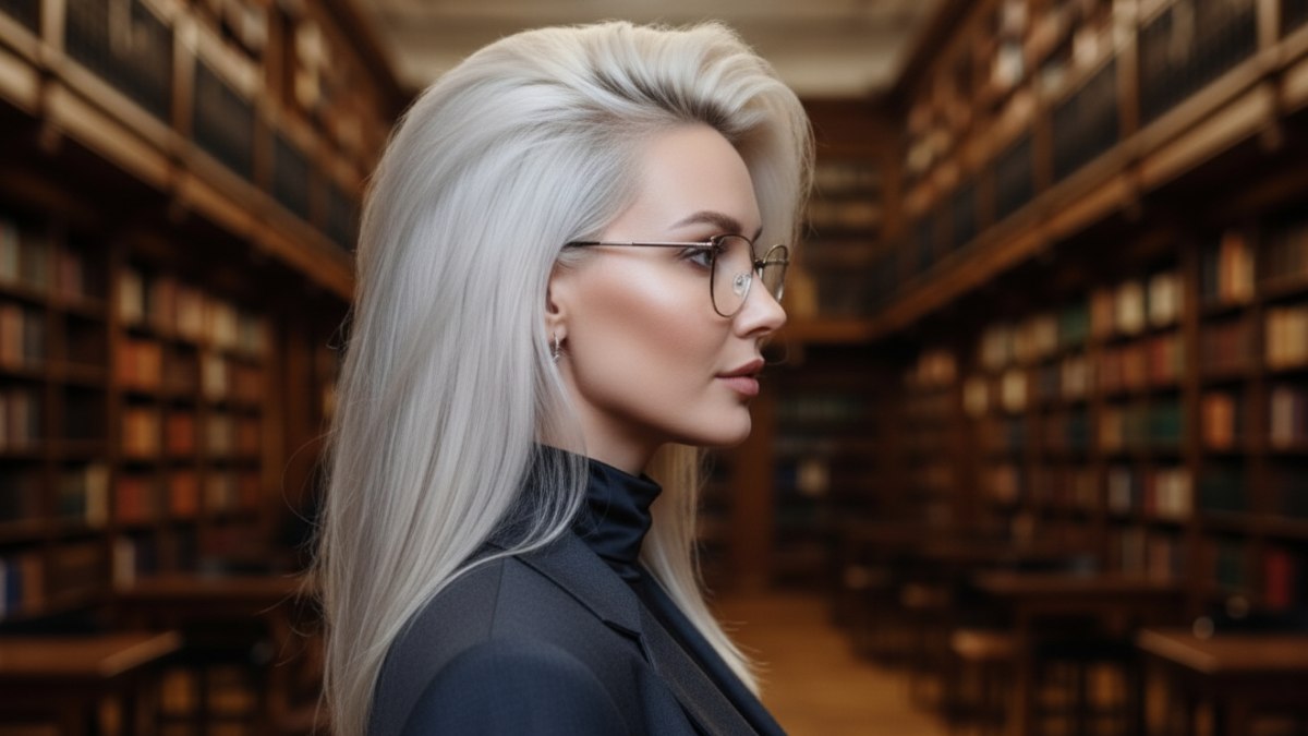 La tenue renforce encore l’impact des cheveux. Le col roulé noir brillant et le blazer anthracite créent un contraste absolu, rendant le platine encore plus lumineux. Cette palette monochrome et tranchée fait des cheveux le point focal incontesté. L’ensemble, à la fois avant-gardiste et classique, exprime une confiance qui reflète la force de cette couleur audacieuse.