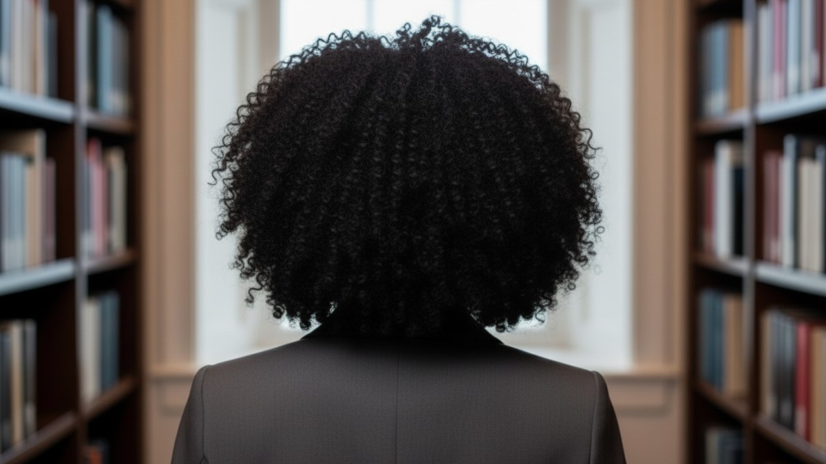 La tenue complète admirablement la coiffure. Le blazer structuré équilibre le volume des cheveux, tandis que le col roulé soyeux couleur terre cuite reflète la richesse de la teinte capillaire. Les lunettes aux lignes épurées ajoutent une touche raffinée et intellectuelle, prouvant que les coiffures audacieuses et naturelles ont parfaitement leur place dans un environnement professionnel.