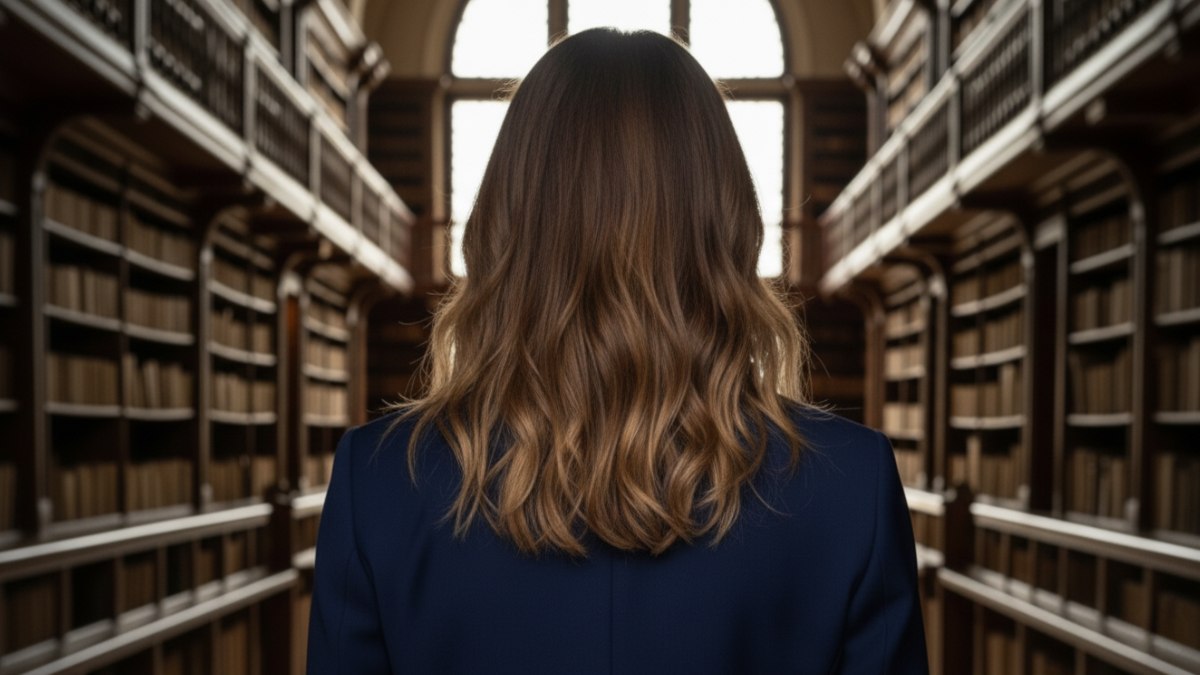 Les cheveux s’harmonisent parfaitement avec le blazer et le col roulé soyeux, et les vêtements aux tons froids créent un beau contraste avec la couleur chaude de la chevelure, faisant ressortir les deux. Les lunettes à monture transparente complètent l’allure contemporaine et intellectuelle.