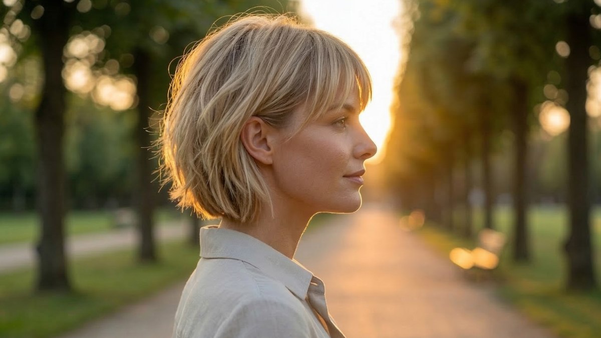 La base brune est ici réveillée par des mèches caramel qui captent la lumière dorée du crépuscule, apportant une profondeur et un relief immédiats. La magie réside dans cette évolution chromatique constante : ce qui semble être une simple coupe courte devient une matière vivante, vibrante et lumineuse au moindre mouvement.