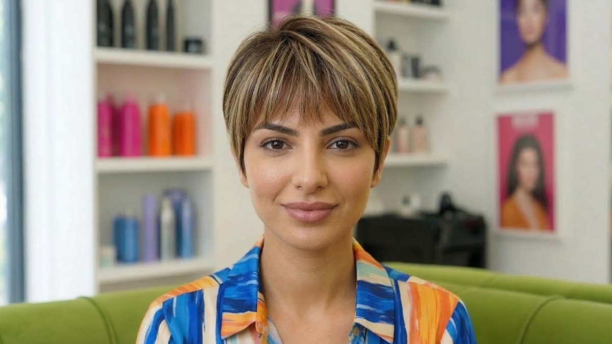 Le chemisier à rayures colorées - mélange audacieux de bleus, d’oranges et de roses - apporte exactement l’énergie qu’il faut. Il rappelle une chose importante : les cheveux courts ne sont pas un choix conservateur, mais un choix profondément confiant. La vivacité de cet imprimé reflète parfaitement la personnalité de la coiffure et de la femme qui la porte.