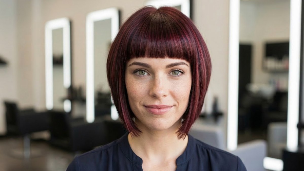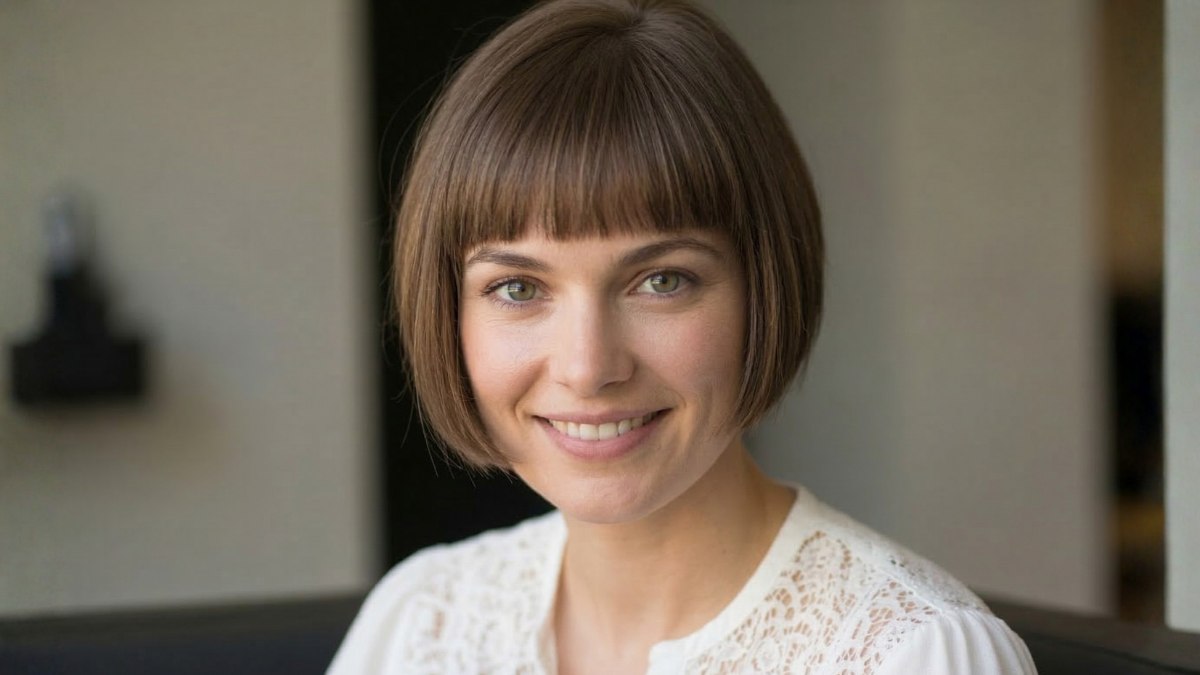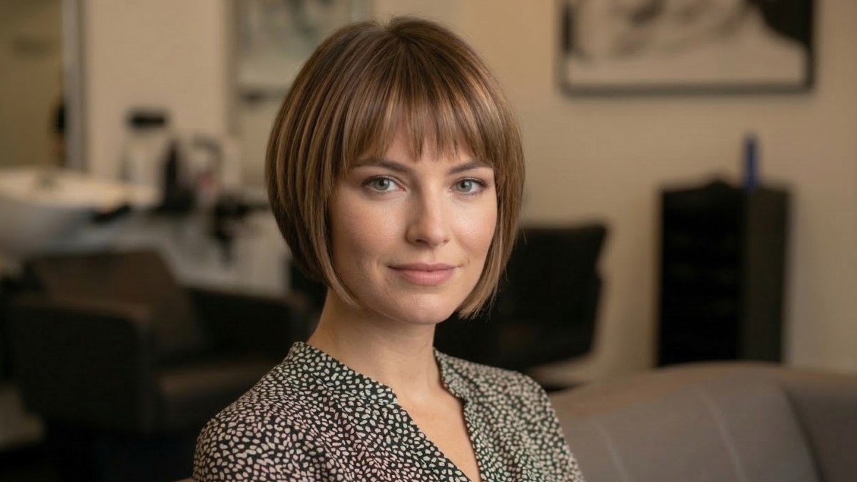 La coupe s’aligne sur la mâchoire, offrant un cadre harmonieux à la plupart des visages. La frange droite, coupée juste au-dessus des sourcils, confère au look une touche rétro chic et volontaire. Loin de figer le style, elle sert de contrepoint à la souplesse du carré, qui conserve assez de rebond pour paraître organique et naturel. La mise en forme est impeccable sans être rigide.