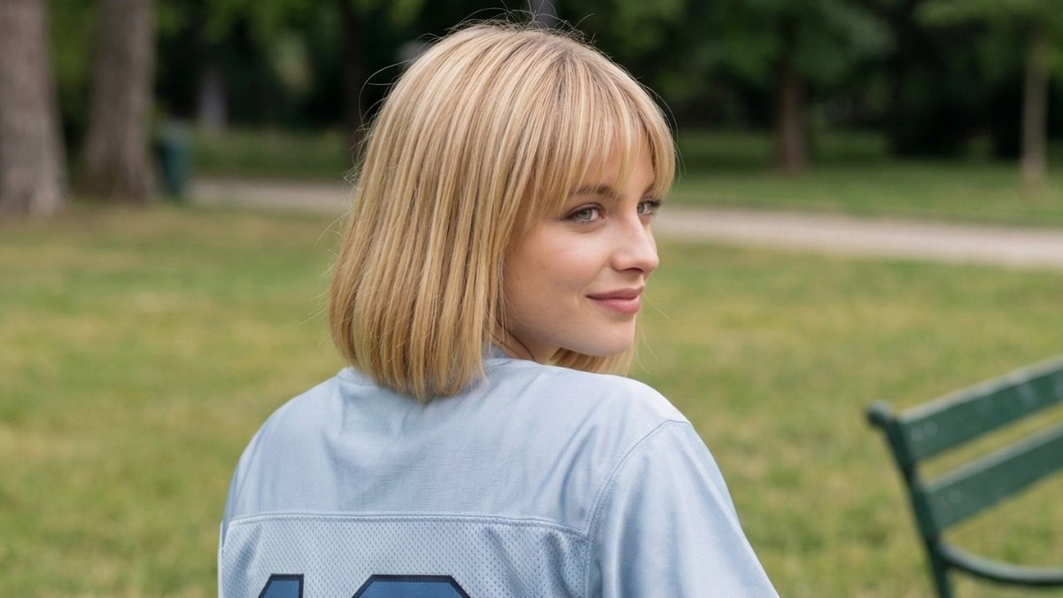 Les cheveux arrivent au niveau de la mâchoire en une seule ligne droite et franche, créant une silhouette si nette qu’elle semble avoir été tracée au rasoir et à la règle. Une frange épaisse et parfaitement droite repose sur le front, encadrant le visage comme un portrait et attirant immédiatement le regard vers les pommettes et les yeux.