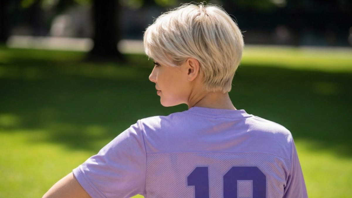 Le tissu lisse et brillant du maillot capte la lumière de la même manière que les cheveux blond platine, renforçant la luminosité globale du look. La lavande est une couleur à la fois douce et inattendue et exactement l’esprit de cette coiffure : discrètement audacieuse et impossible à ignorer.