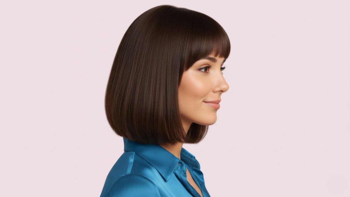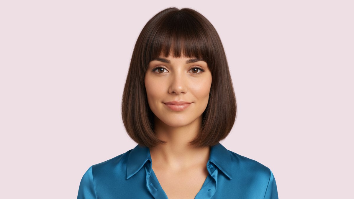 Le coiffage vise la perfection du lisse et de l’éclat. Un brushing à la brosse plate pour la tension, suivi d’un fer à lisser pour éliminer tout mouvement, jusqu’à un effet soyeux et régulier. La frange demande une attention particulière pour rester droite et impeccable, complétant la ligne graphique.