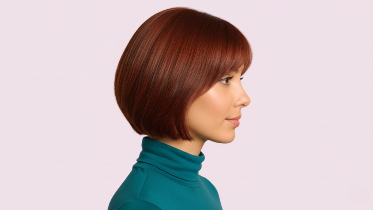 Il y a quelque chose de magique dans l’association d’un carré classique et d’un auburn chaleureux. C’est comme s’envelopper dans des feuilles d’automne : à la fois chaleureux, accueillant et raffiné. La coupe, équilibrée, tombe entre le menton et les épaules, encadrant le visage avec élégance.