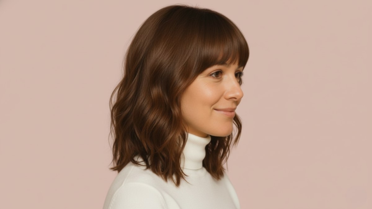 Entretenir cette coiffure demande un peu de soin. La frange complète nécessitera des retouches régulières pour maintenir une ligne précise, tandis que les vagues, bien que d’apparence naturelle, bénéficieront d’un léger coiffage. Un fer à friser à baril moyen peut aider à créer ces douces vagues, qui peuvent ensuite être légèrement ébouriffées avec les doigts ou un peigne à larges dents pour une finition décontractée et soignée. Un spray texturisant ou de sel marin peut encore renforcer les vagues, les aidant à conserver leur forme tout au long de la journée.